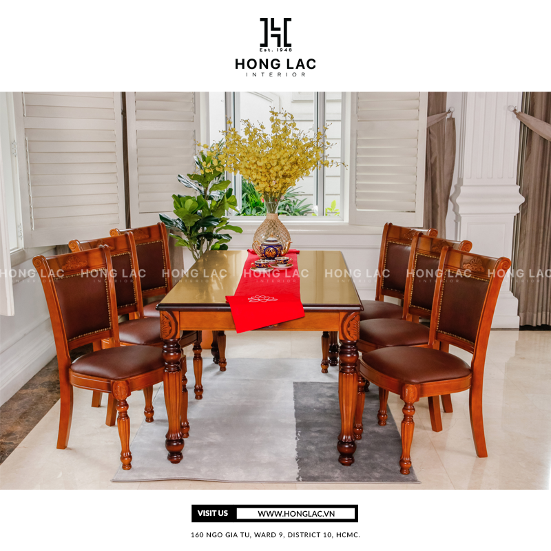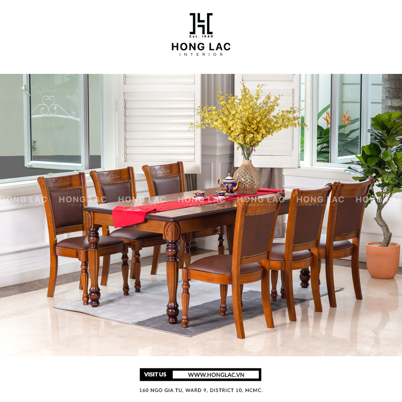 - Sản phẩm BÀN ĂN TF09 được cung cấp bởi HONG LAC INTERIOR, thiết kế theo phong cách Cổ điển, gia công từ chất liệu gỗ cao su tự nhiên kết hợp với PVC/Vải cao cấp được xử lý kỹ lưỡng và chống mối mọt, nhằm đảm bảo độ bền, ổn định và giữ nguyên hình thái sắc nét của chủ thể.